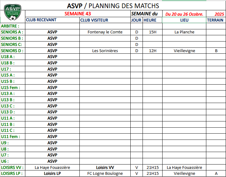 Planning semaine 43 du 20 au 26 Octobre 2025