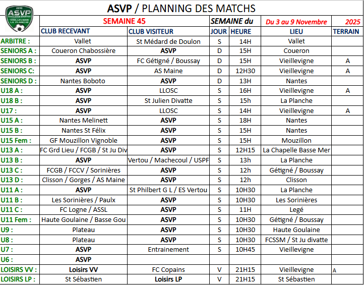 Planning semaine 45 du 3 au 9 Novembre 2025