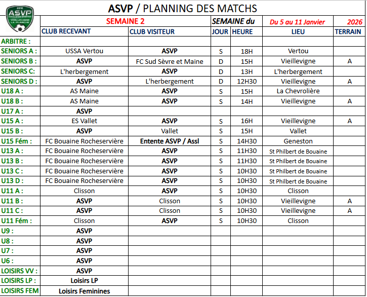 Planning semaine 2 du 5 au 11 Janvier 2026